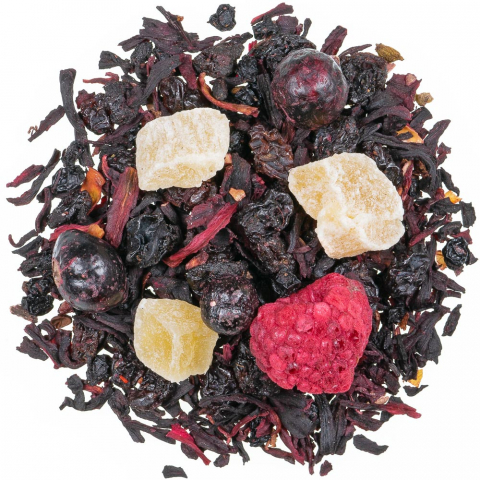 Zutaten:Hibiskusblüten, Weinbeeren, Holunderbeeren, kandierte Ananasstücke (Ananas, Zucker), Aroma, schwarze Johannisbeeren, Himbeeren
