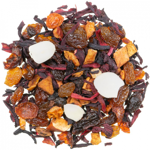 Zutaten:Hibiksusblüten, Weinbeeren, Apfelstücke, Hagebuttenschalen, Aroma, Mandelflakes (1%), Nelken