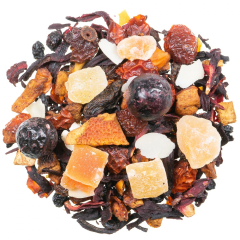 Zutaten:Hibiskusblüten, Apfelstücke, Weinbeeren, Orangenschalen, Hagebuttenschalen, kandierte Ananasstücke (Ananas, Zucker), Holunderbeeren, Aroma, kandierte Papayastücke (Papaya, Zucker), Mandelflakes, Zimtrinde(1%), Vanillestücke(0,5%), schwarze Johannisbeeren