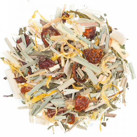Zutaten:Hagebuttenschalen, Lemongras, Pfefferminzblätter, Grüntee China Sencha, Ringelblumenblüten