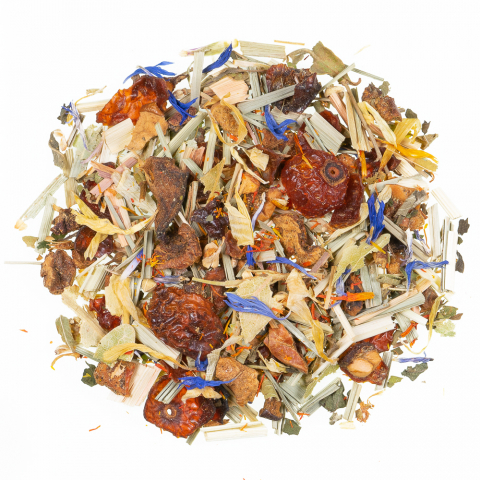Zutaten:Apfelstücke, Hagebuttenschalen, Lemongras, Silberlindenblüten, Pfefferminzblätter, Aroma, Verbenenkraut, Ringelblumenblüten, Kornblumenblüten, Saflorblüten
