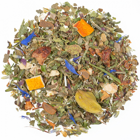Zutaten:Tulsikraut*, Rooibos*, Melissenblätter*, Apfelstücke*, Verbenenkraut*, Zimtrinde*, Orangenschalen* (5%), natürl. Aroma, Kardamom*, Hanfblätter* (2%), Lavendelblüten*, Ginsengwurzel*, Kornblumenblüten* / *aus kontrolliert biologischem Anbau