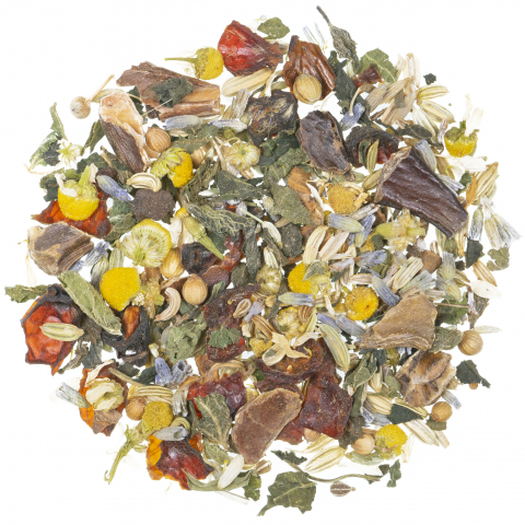 Zutaten:Fenchel*, Hagebuttenschalen*, Kamillenblüten*, Johannisbrotstücke*, Lavendelblüten*, Koriander*, Zimtrinde*, Brennnesselblätter*, Anis* /*aus kontrolliert biologischem Anbau