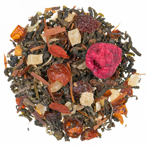 Zutaten:Grüner Tee, kandierte Ananasstücke (Ananas, Zucker), Hagebuttenschalen, natürl. Aroma, Salbeiblätter, Lapachorinde,Holunderbeeren, Gojibeeren (3%), Himbeeren, Ginsengwurzel (0,5%)