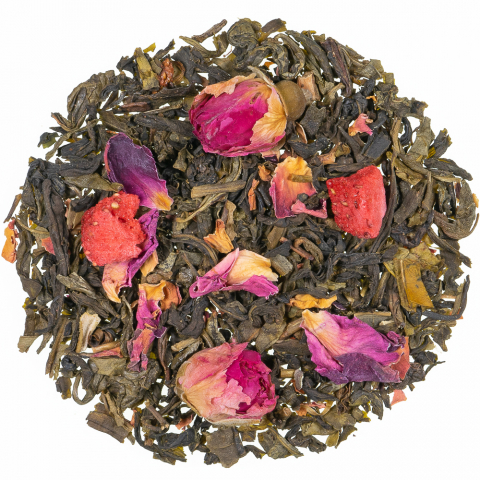 Zutaten:Grüntee China Ming Mee, -Wu Lu, -Gunpowder, Aroma, Rosenblütenblätter, Rosenknospen, Erdbeerstücke