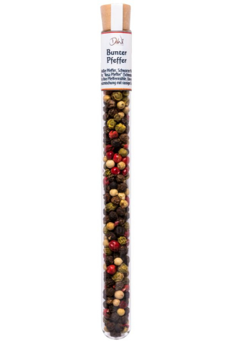 Zutaten: Weißer Pfeffer, Schwarzer Pfeffer, Grüner Pfeffer, Rosa Pfeffer (Schinusbeeren).